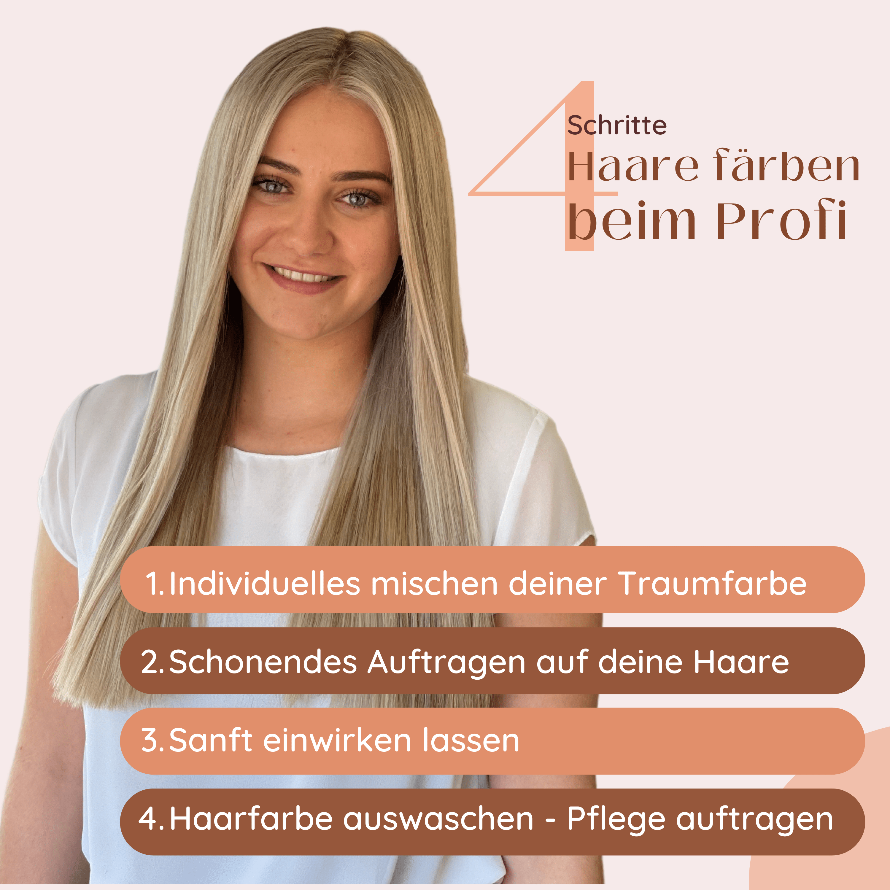 Wir legen großen Wert darauf, dir das beste Farberlebnis zu bieten. Wir begleiten dich in vier einfachen Schritten zu deiner Traumhaarfarbe: